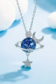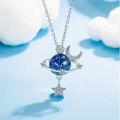 Mavi gezegen temalı merkezi taş, derin evreni ve sonsuzluğu simgelerken; parıldayan ay ve yıldız detayları ruhunuza zarif bir parıltı katar.